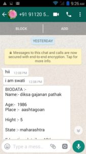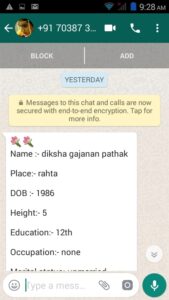 आप इस दो स्क्रीनशॉट में एक ही लड़की के दो शहरो के नाम से बानी फेक प्रोफाइल भेजी गयी थी। उसीसी पता चलता है के झूठ और फरेब की बुनियाद पर जन्मो के रिश्ते को जोड़ने का यह पवित्र काम इन रिश्तो के सौदागरों के हाथ में चला गया है। जो एक सोची समझी साजिश तहत यह मॅट्रिमोनी का धंदा चलनेवाले अभिभावकों की भावनाओंसे खिलवाड़ कर अपनी जेब भर रहे है। साथ ही इस जालसाजी के धंदे में जरुरत मंद मजबूर लड़के लड़कियों से झूठे नाम से कारोबार चला रहे है। गौर करने लायक और एक बात है ,इनका एकाद दूसरा नंबर संस्था के नाम पर लिया हुवा है। क्यू के इसी नंबर से इस फर्जीवाड़े को चलनेवाली वेब साइट रजिस्टर की गयी है। हमारी इस केस में लड़की की माँ इसी संस्था को कोई रेप्रेजेंटिटिव है ,जो केवल ऑफिस के खुलते ही बात कर रही थी। जब यह सब यकींन में बदल गया तो हमने हमारे पैसे वापस करो यह मेसेज व्हाट्सअप किया। उसके बाद किसी सुपीरियर ने आपको तुरंत दस रिश्ते दिखता हु या उनकी डिटेल व्हाट्सअप कर भेजता यह कहा। अब आपका आय डी बन चूका है आपको यूजर और पासवर्ड व्हाट्सअप किया है। उसके जरिये आप चाहे जितने लड़कियों के बायोडेटा हमारी वेब साईट पर देख सकते है। यह कहा गया। पर जो झूठा रिश्ता दिखाया था उसका जिक्र करनेसे पहले ही फोन काट दिया।