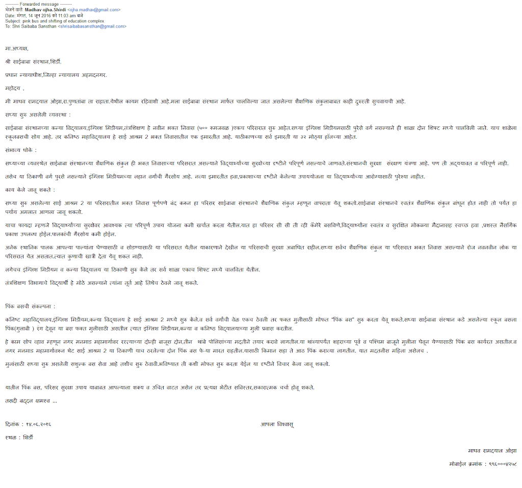 दुर्भाग्य से आज तक मुझे इसके लिए संघर्ष करना पड़ रहा है। इसी को जोड़ कर साईबाबा शिक्षा संस्था के विस्तार का नया प्रोजेक्ट मैंने तैयार किया है उसका रेप्रेसेंटेशन किया है। आशा करते है साई जल्द ही इसे शुरू करवाने की बुद्धि प्रशासन चलनेवालों को प्रदान करेंगे।